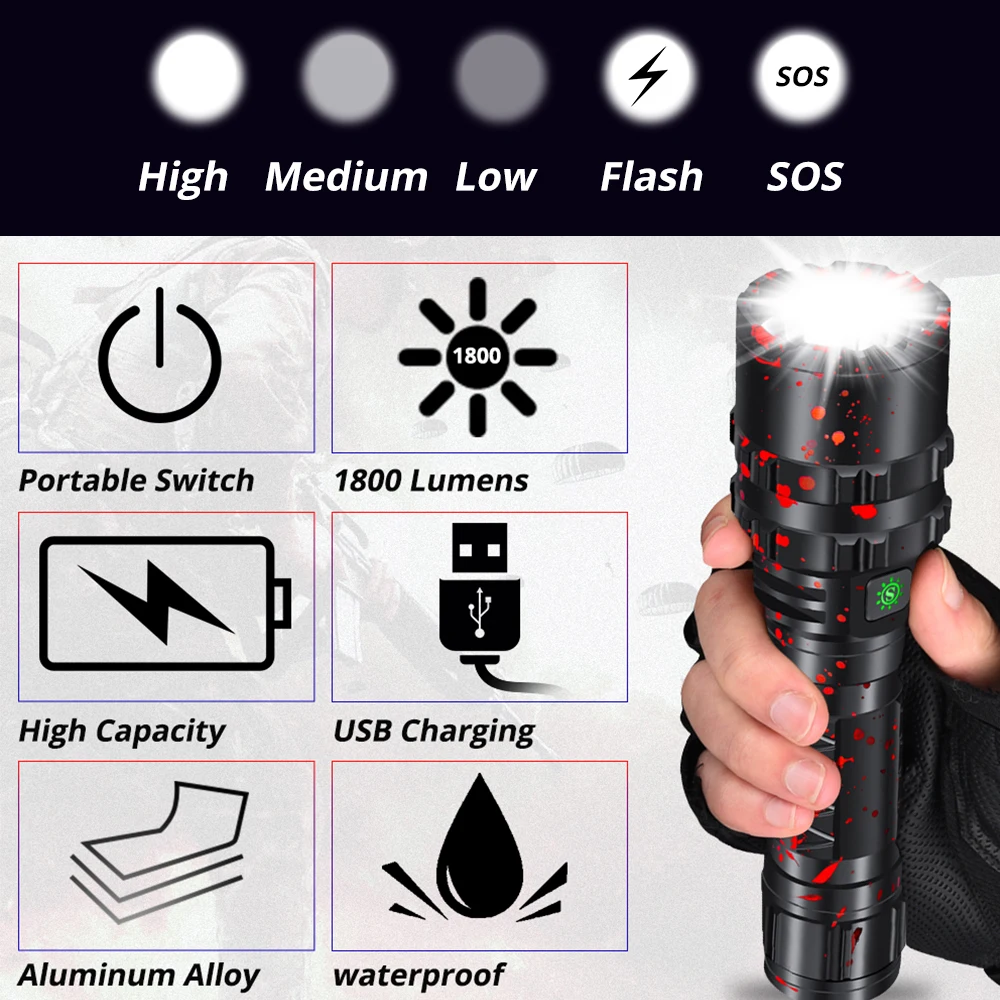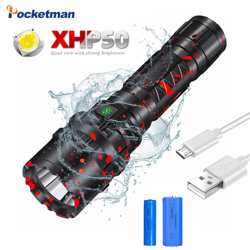 Unique XHP50.2 High powerful LED tactical flashlight USB Charging hunting torch waterproof use 1865