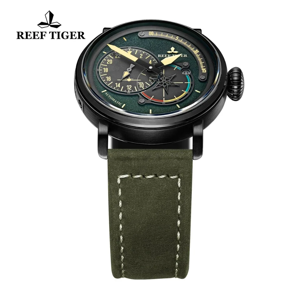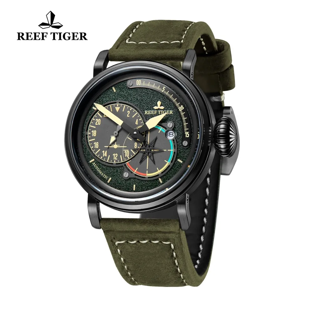 Best Seller Reef Tiger/RT Black Steel Military Watches for Men Genuine Leather Strap Automatic Pilot Watch with